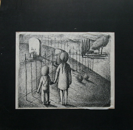 Pen & ink, 10-3/4 x 13-1/2, in 18-1/2 x 19 mat. Wrinkled.