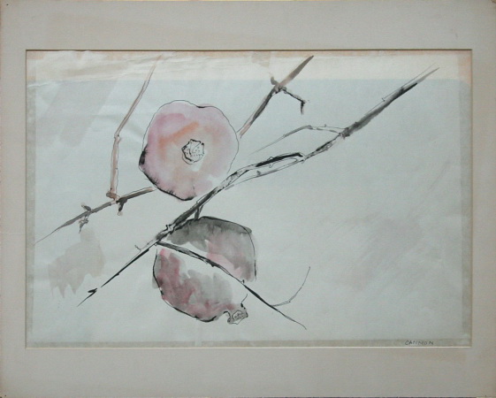 Pen & ink with watercolor, 12x18 in 15x20 mat. Signed. Moderate wrinkling. Image discolored near edges.