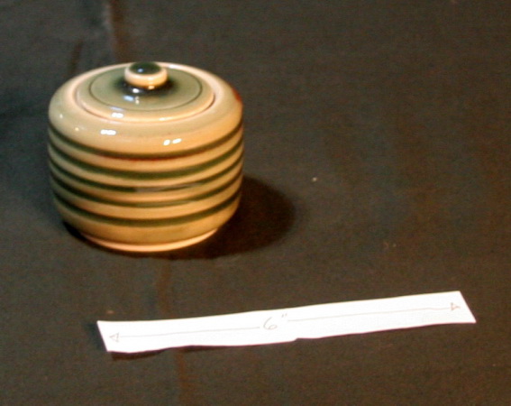 Bowl with lid by Al King. Second photo shows chip in lid rim. Photo fails to show a nice flush of red glaze on backside, as suggested by the red area on right side of top edge in this photo.