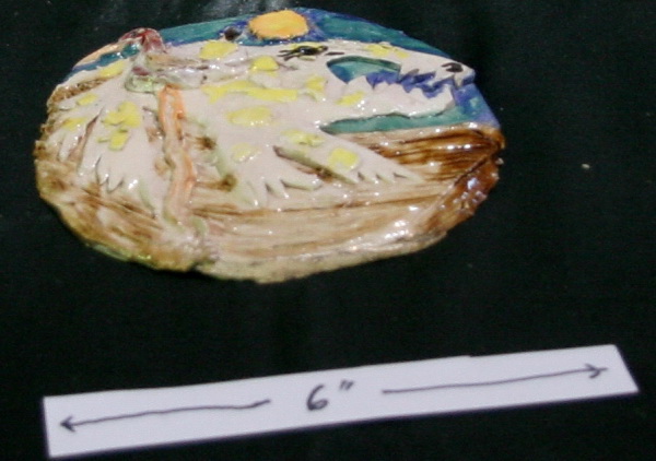 Ceramic medallion by Dorothy with crane and bear.